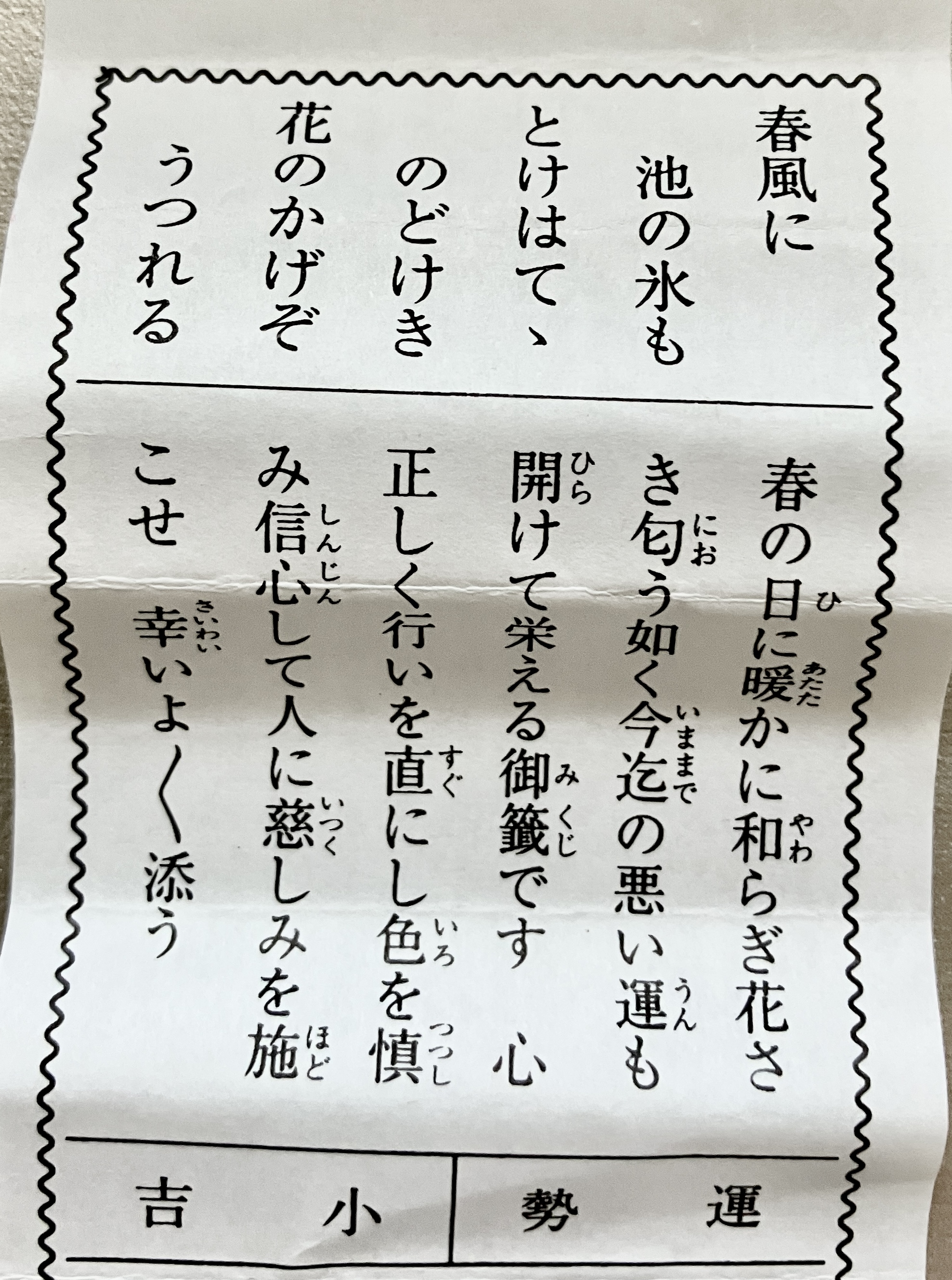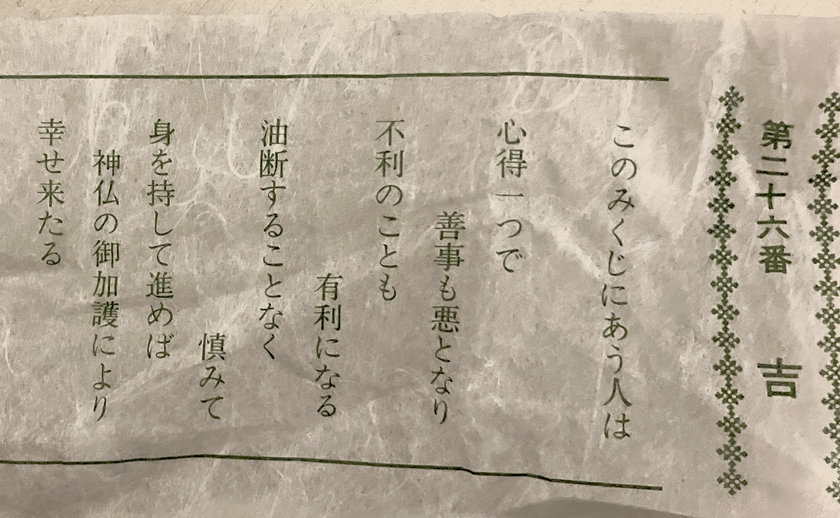 私はおみくじを引くと、小吉とか末吉しか見たことないのですが、大吉かどうかよりも「ちゃんと見てるぞ」と言っていただけたようで、すごくありがたかったです。
