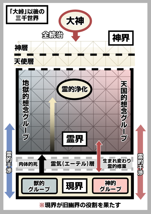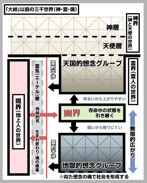 「大峠以前」の三千世界では、「幽界」が現界と霊界のクッションの役割を果たしていました。